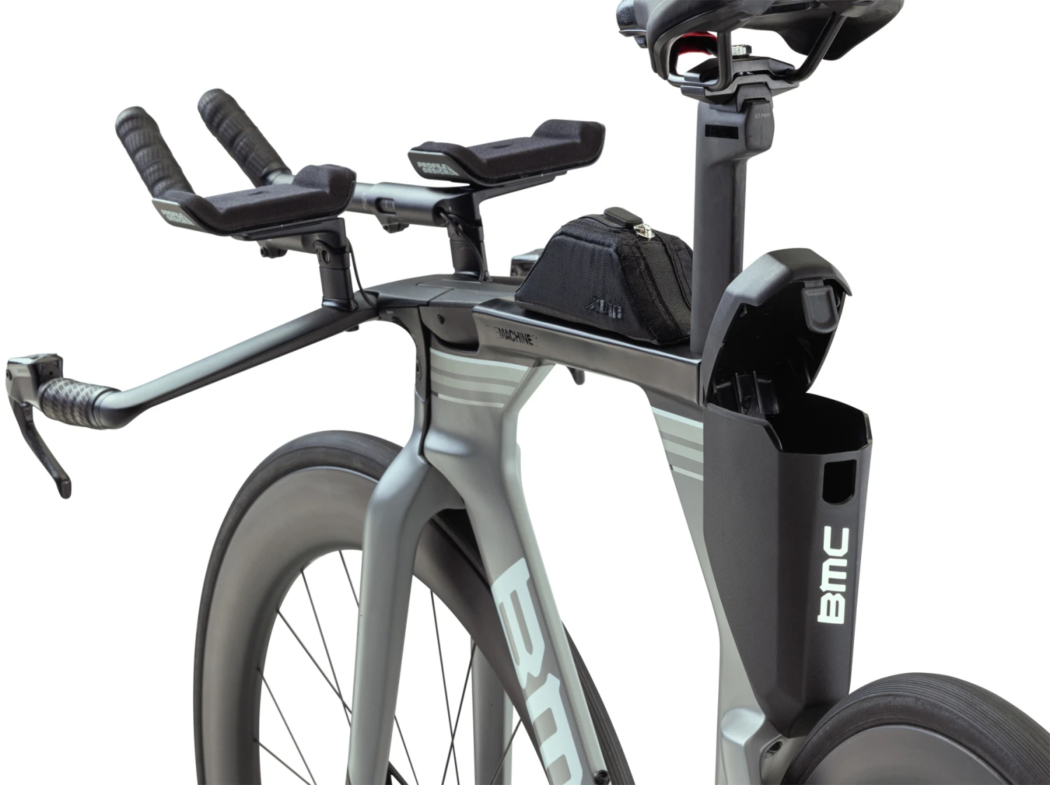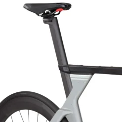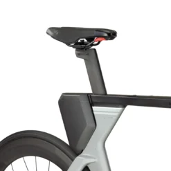 Carbon TT-frameset met carbon vork, platte cockpit, carbon extensies en aero carbon zadelpen.
