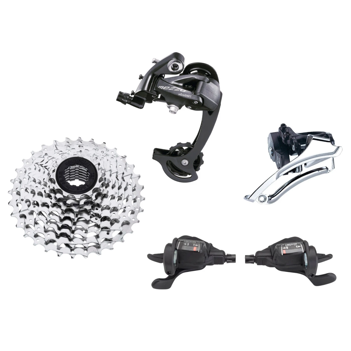 Intuïtief schakelgedrag & groot bereik. 3×8-speed MEZZO groep met shifter, achterderailleur, voorderailleur en cassette.